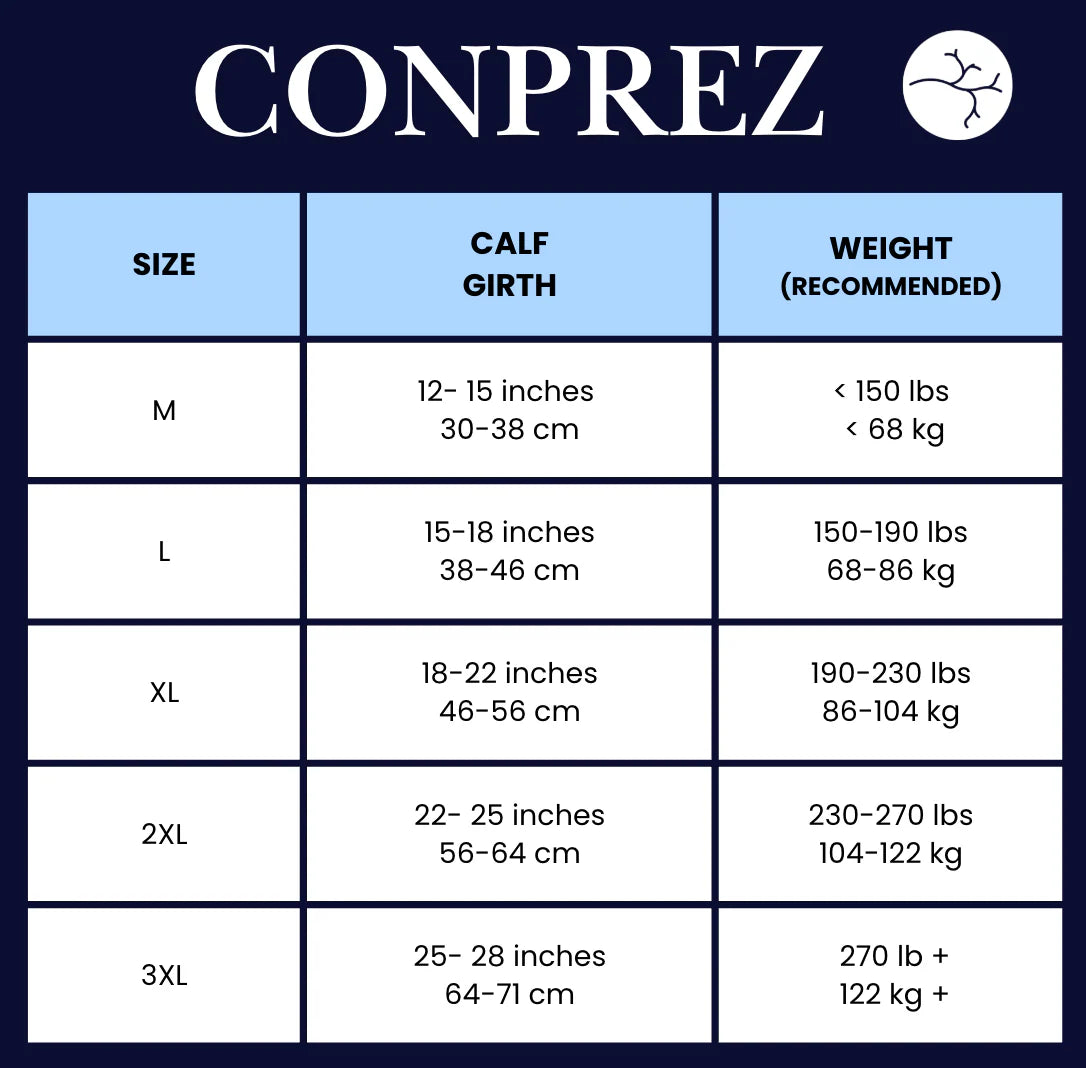 Conprez compression socks use gentle 15–20 mmHg graduated compression to help reduce swelling.